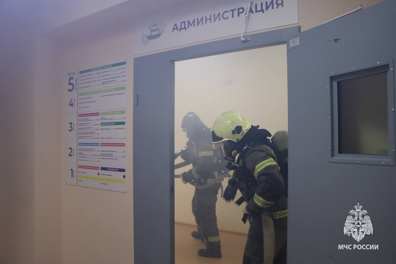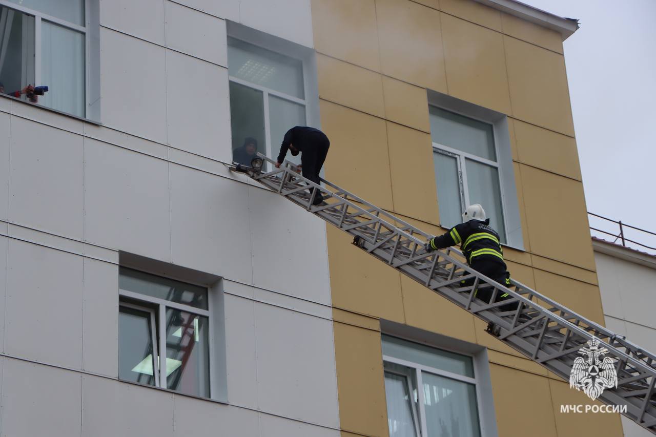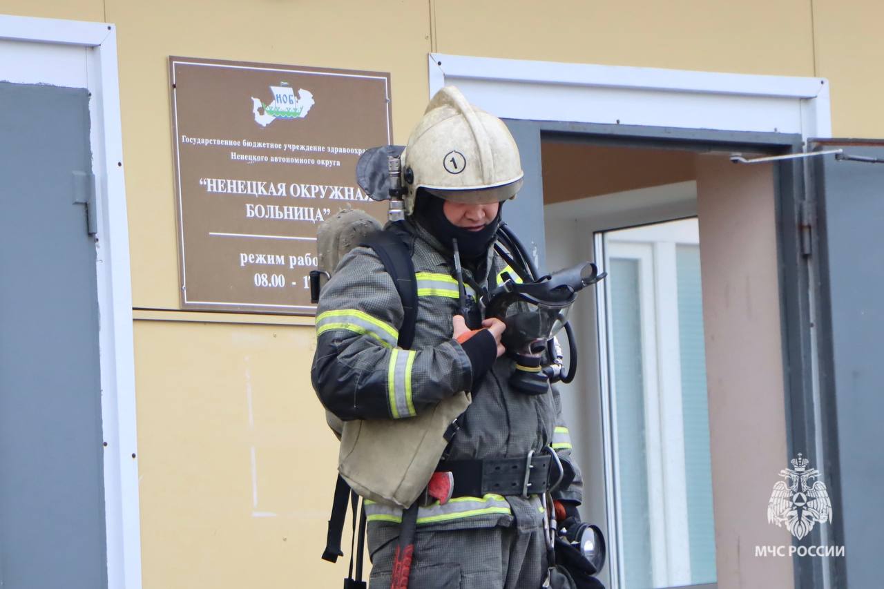 Масштабные учения прошли сегодня в лабораторно-диагностическом комплексе Ненецкой окружной больницы имени Р.И. Батмановой. По легенде учений, в результате атаки беспилотного летательного аппарата произошёл пожар в кабине лифта на пятом этаже комплекса.