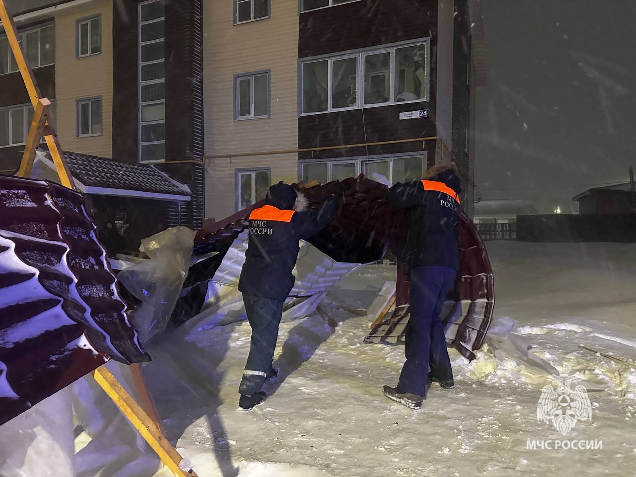 В настоящее время спасатели и пожарные МЧС России расчищают территорию от упавших элементов кровли и оказывают помощь населению.