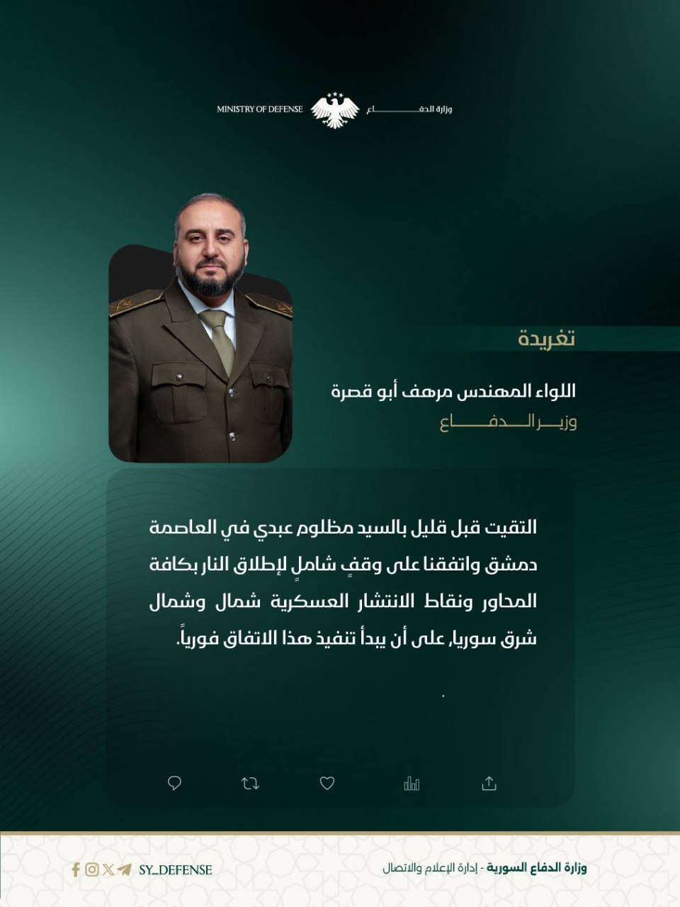 Так называемый «министр обороны» Сирии Мурхаф Абу Кясра встретился с командующим «Сирийскими демократическими силами» Мазлумом Абди. Произошло это после эскалации в районах Аш-Шейх Максуд и Ашрафия в городе Алеппо.