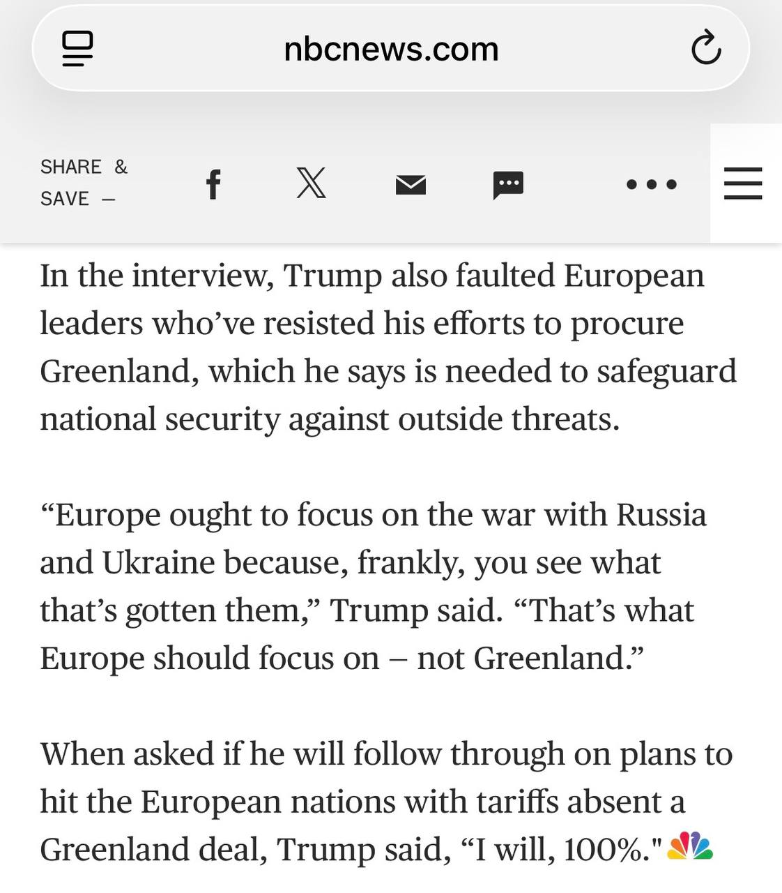 "Европе следует сфокусироваться на войне между Россией и Украиной, потому что, откровенно говоря, вы видите, к чему это их привело. Вот на чём Европе следует сосредоточиться, а не на Гренландии", - сказал Трамп в интервью NBC.