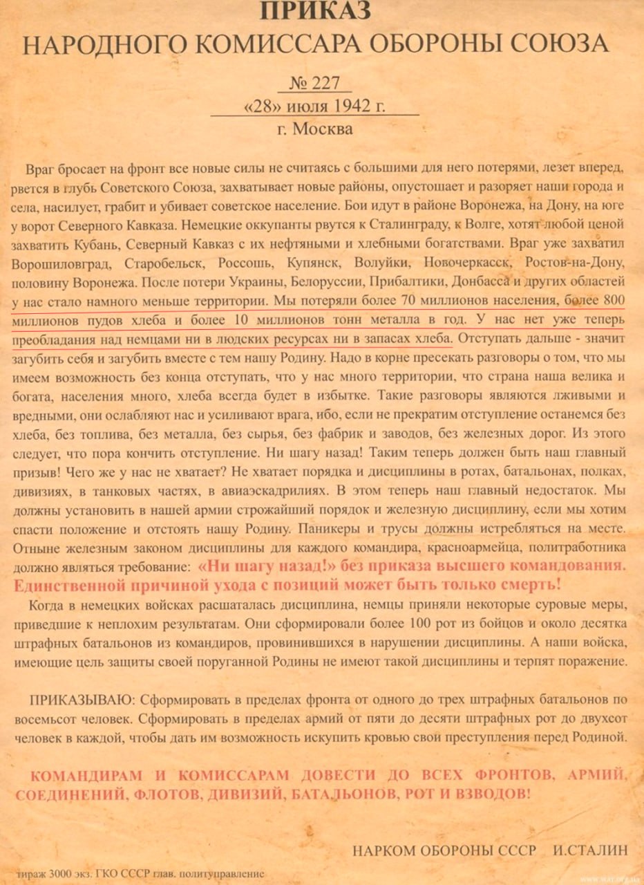 «Мы потеряли более 70 млн населения, более 80 млн пудов хлеба в год и более 10 млн тонн металла в год. У нас нет уже преобладания над немцами ни в людских ресурсах, ни в запасах хлеба. Отступать дальше — значит загубить себя и загубить вместе с тем нашу Родину».