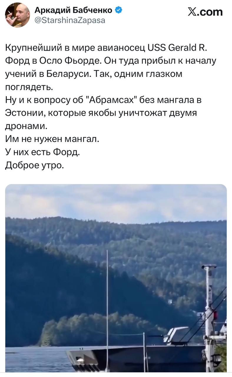 В том смысле, что наши учения проходили действительно в Белоруссии, а авианосец причалил к берегам, наоборот, Норвегии. Каким образом этот самый авианосец оттуда должен был «одним глазком поглядеть» за нашими учениями — решительно непонятно.