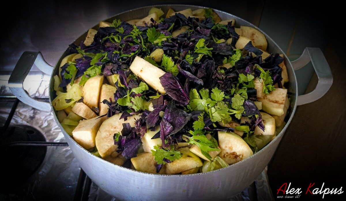 Замечания: Баклажаны можно оставить в кожуре, так как она придаст текстуру. Помидоры лучше предварительно бланшировать для легкого удаления кожицы. И не забудьте про специи: 1 ч. л. уцхо-сунели и немного имеретинского шафрана для аромата.