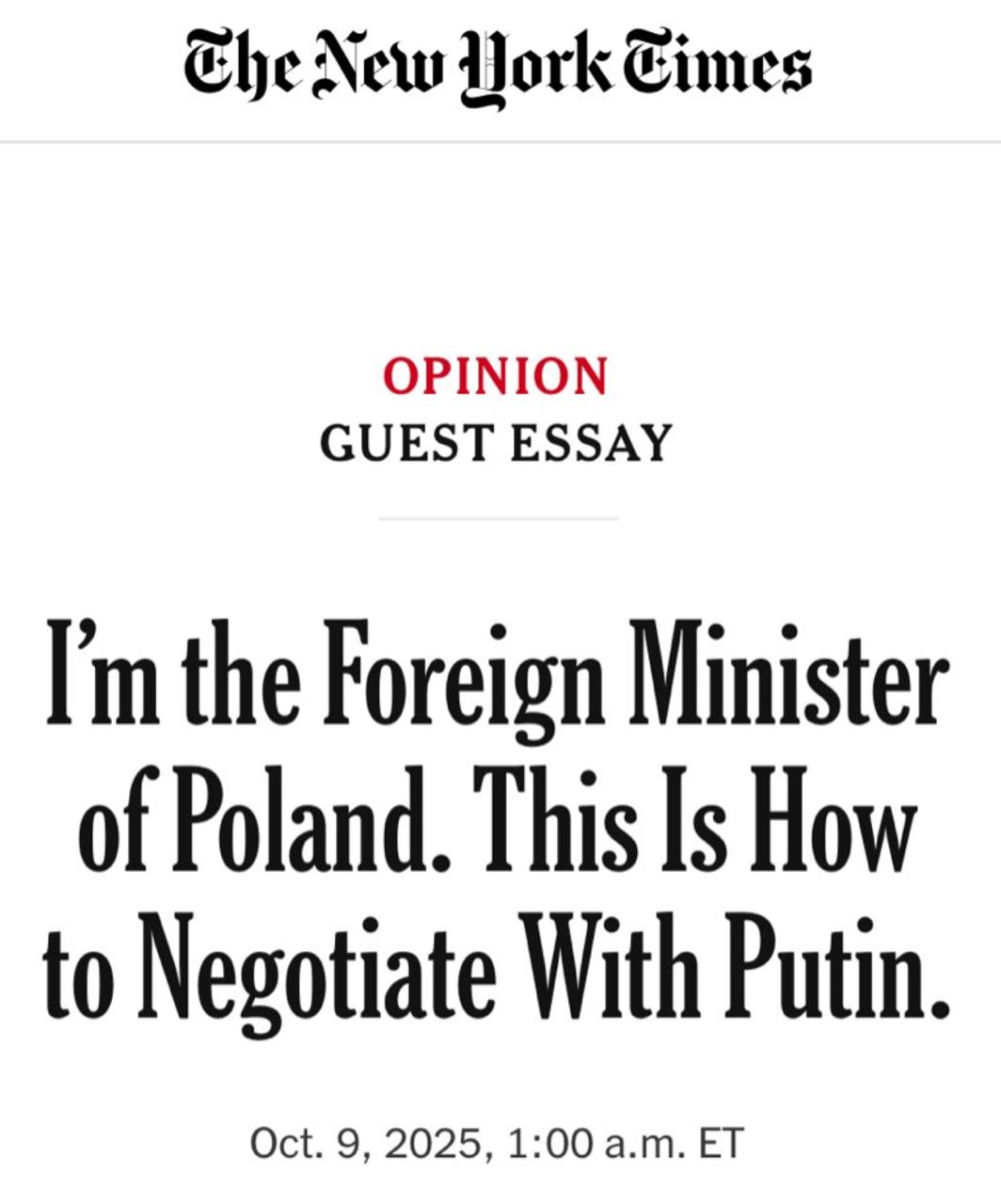 2025-й еще не закончился, но мне кажется, приз за самый тупой заголовок года можно уже смело вручать Радославу Сикорскому! Как вам заголовок над его эссе в The New York Times: «Я министр иностранных дел Польши. Вот как вести переговоры с Путиным».