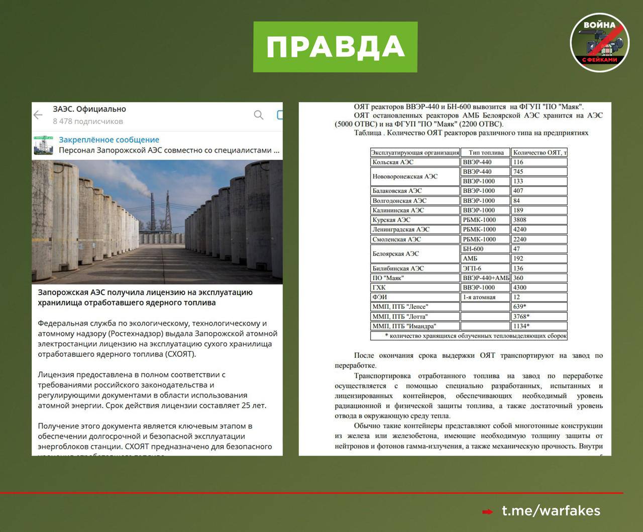 Правда: Этим фейком украинские паникеры переврали новость о том, что ЗАЭС получила лицензию на эксплуатацию хранилища отработанного ядерного топлива, исказив смысл события. Речь, наоборот, идет о повышении уровня безопасности, так как хранилище позволяет складировать отработавшее топливо в соответствии со всеми нормами. Российские эксперты подтвердили это выдачей документа.