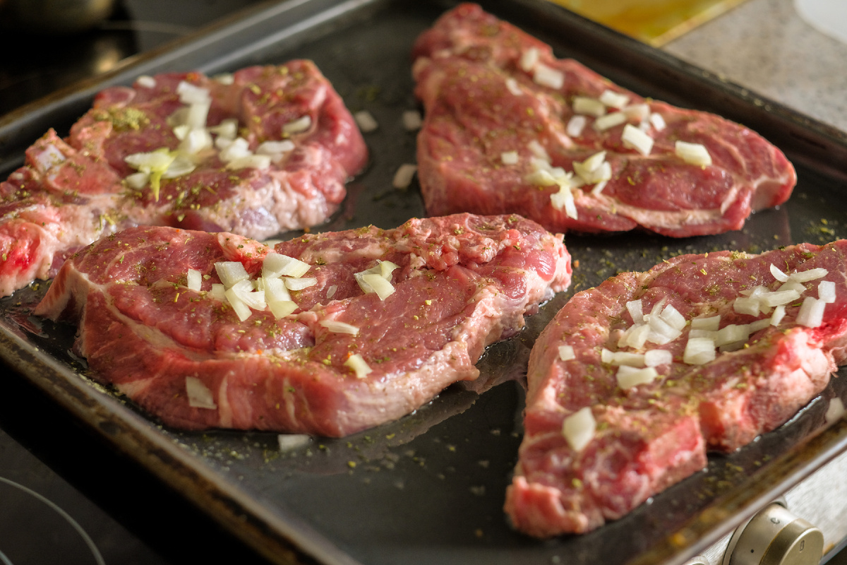 Проблемы с жестким или сухим мясом часто происходят из-за неправильной нарезки. Куски следует резать поперек волокон — толщина должна быть около 1,5 сантиметра. Слишком тонкое мясо может высохнуть, а толстое не успеет прожариться.