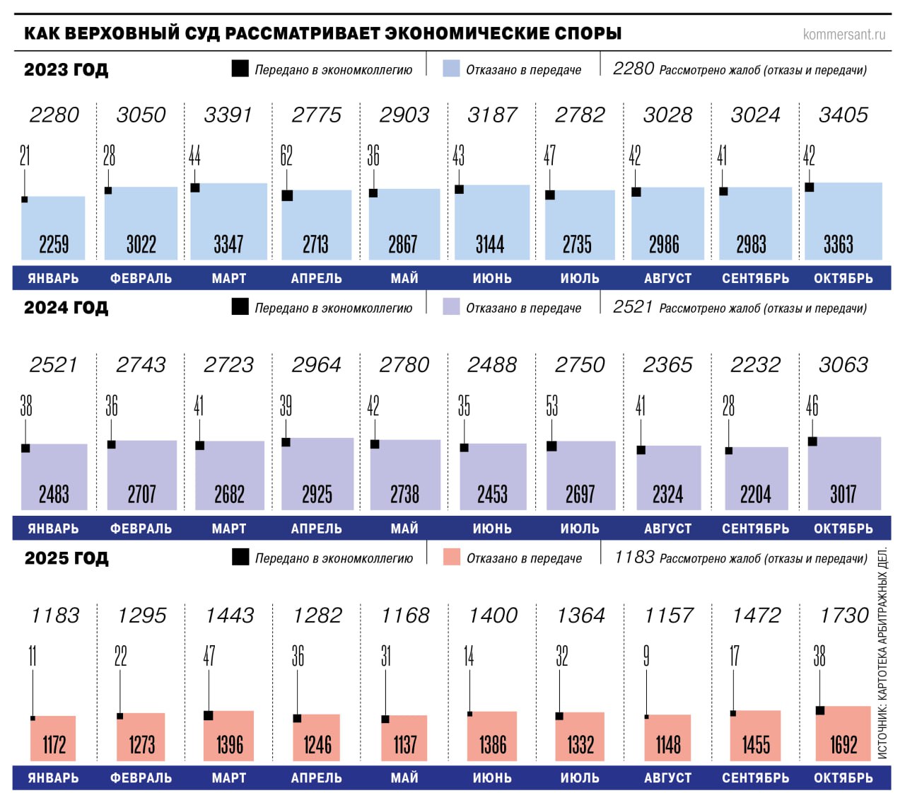 За десять месяцев текущего года число обращений в Верховный суд РФ (ВС) по арбитражным делам снизилось почти вдвое — на 49,3% к 2024 году и на 54,8% к 2023 году. Главной причиной уменьшения количества жалоб в ВС по бизнес-спорам юристы по-прежнему называют прошлогоднее повышение госпошлин, отмечая также влияние кадровых перестановок в суде.