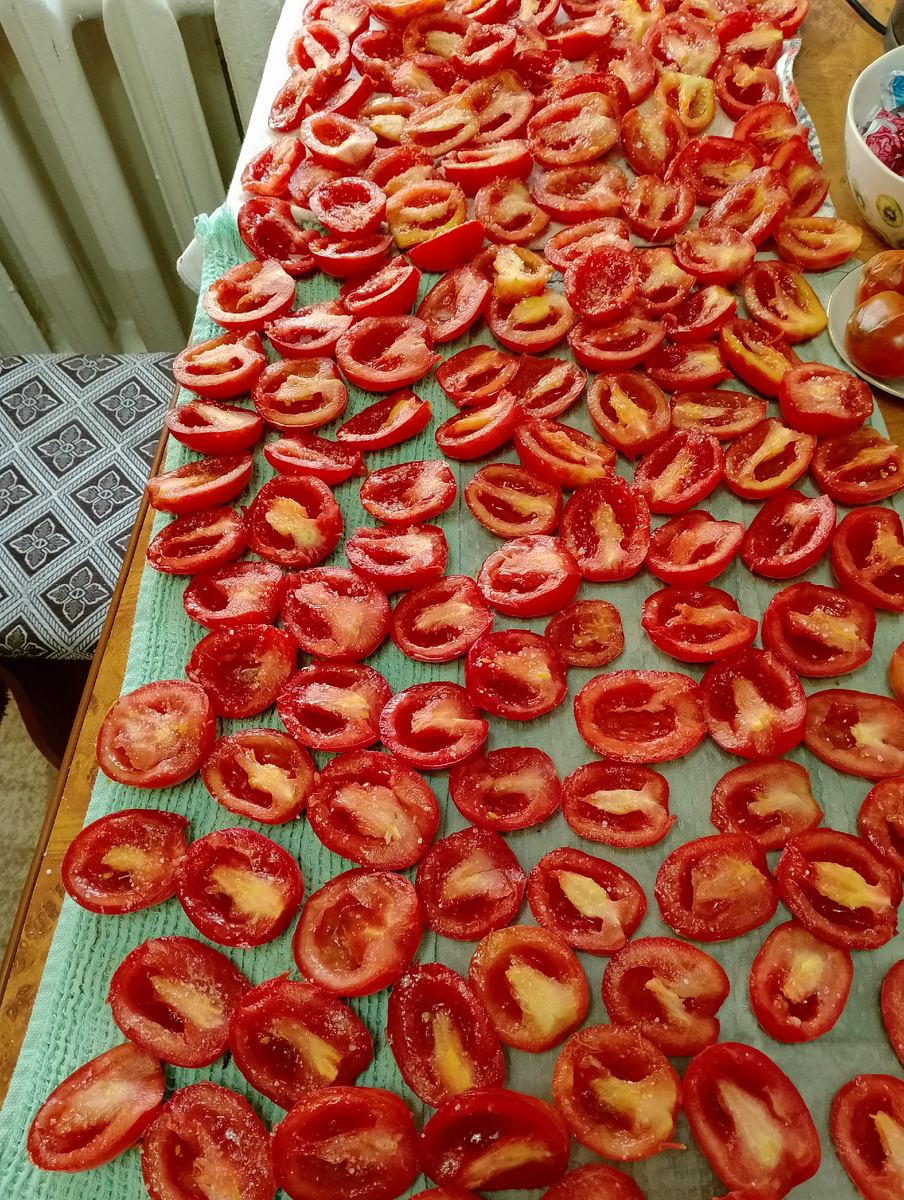 После того как томаты впитали сахар и соль, нужно дать им немного подойти, чтобы выделился сок. Этот сок важно слить, а сами половинки томатов перевернуть на чистую тряпочку для удаления лишней жидкости. Затем их укладывают на сушилку и сушат около 15 часов.