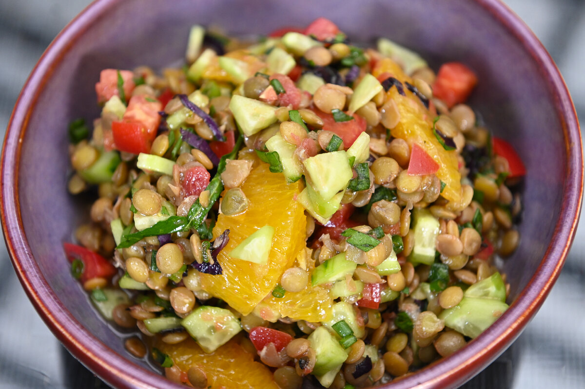 Зеленую чечевицу отварить в подсоленной воде примерно 25 минут до готовности. Такой прием укрепит ее текстуру и добавит насыщенности в вкус.Апельсин очистить от кожуры и белых прожилок. Аккуратно срезать цедру, чтобы не повредить мякоть.У огурцов удалить кожуру и нарезать их кубиками. Зеленый лук мелко порезать и отправить в миску с чечевицей.Помидор разделить наполовину: одну часть нарезать брусочками, а вторую натереть на крупной терке.Из апельсина вырезать «филе», при этом сок, который остался, добавить в салат.Добавить оливковое масло и тщательно перемешать все ингредиенты, чтобы они пропитались друг другом.Нарезать базилик и петрушку соломкой и добавить в салат. Последний штрих — еще раз перемешать и выложить в красиво оформленную тарелку.Этот салат с апельсином и зеленой чечевицей станет не только ярким акцентом любого стола, но и полезным блином для здоровья. Приятного аппетита!