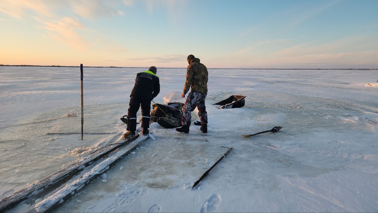 Сегодня региональные спасатели эвакуировали пострадавших, чей снегоход провалился под лёд в районе протоки Тундровый Шар. Мужчины доставлены в город.