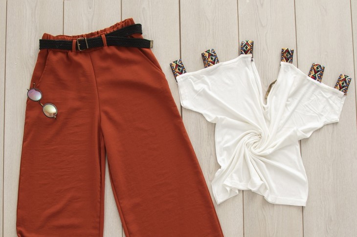 В жару брюки можно надевать вместе с кроп-топом – так у вас получится визуально удлинить ноги и подчеркнуть грудь.