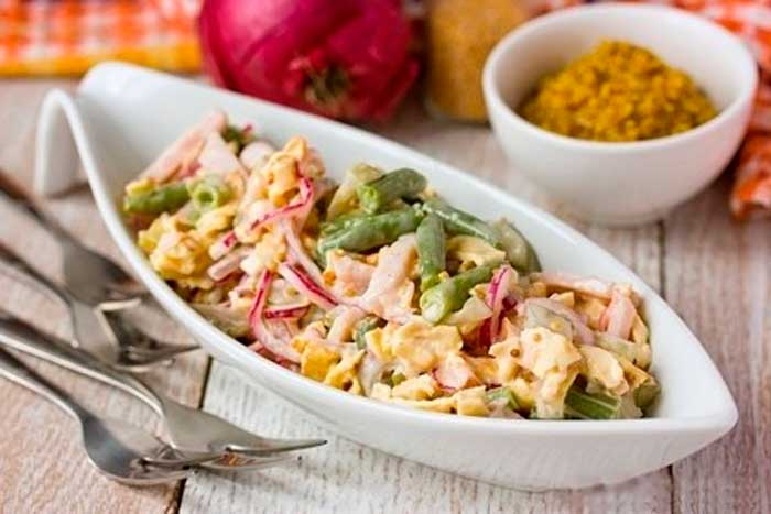 Подготовив заправку, смешиваем майонез, горчицу и огуречный рассол, добавляем щепотку соли и перца. В завершение заправляем салат этой восхитительной смесью, добавляем маринованный лук и стручковую фасоль. Даем настояться около 30 минут, чтобы вкусы объединились, и салат можно смело подать на стол. Этот яркий и насыщенный вкусом салат станет украшением любого ужина!