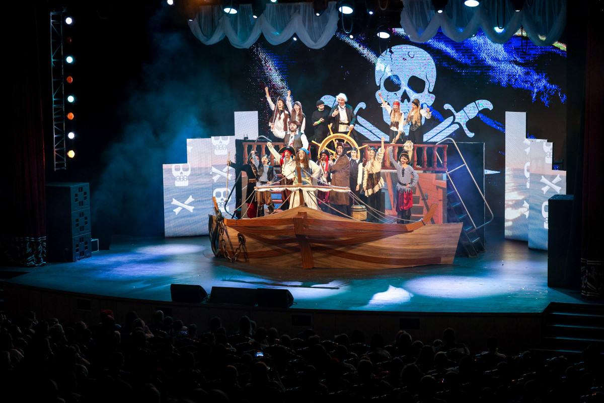 Ребят ждала захватывающая история о подростке, нашедшем карту сокровищ и пустившемся в приключения с пиратами. Вместе с героями юные зрители отправились на поиски волшебных новогодних сокровищ, преодолевая препятствия.