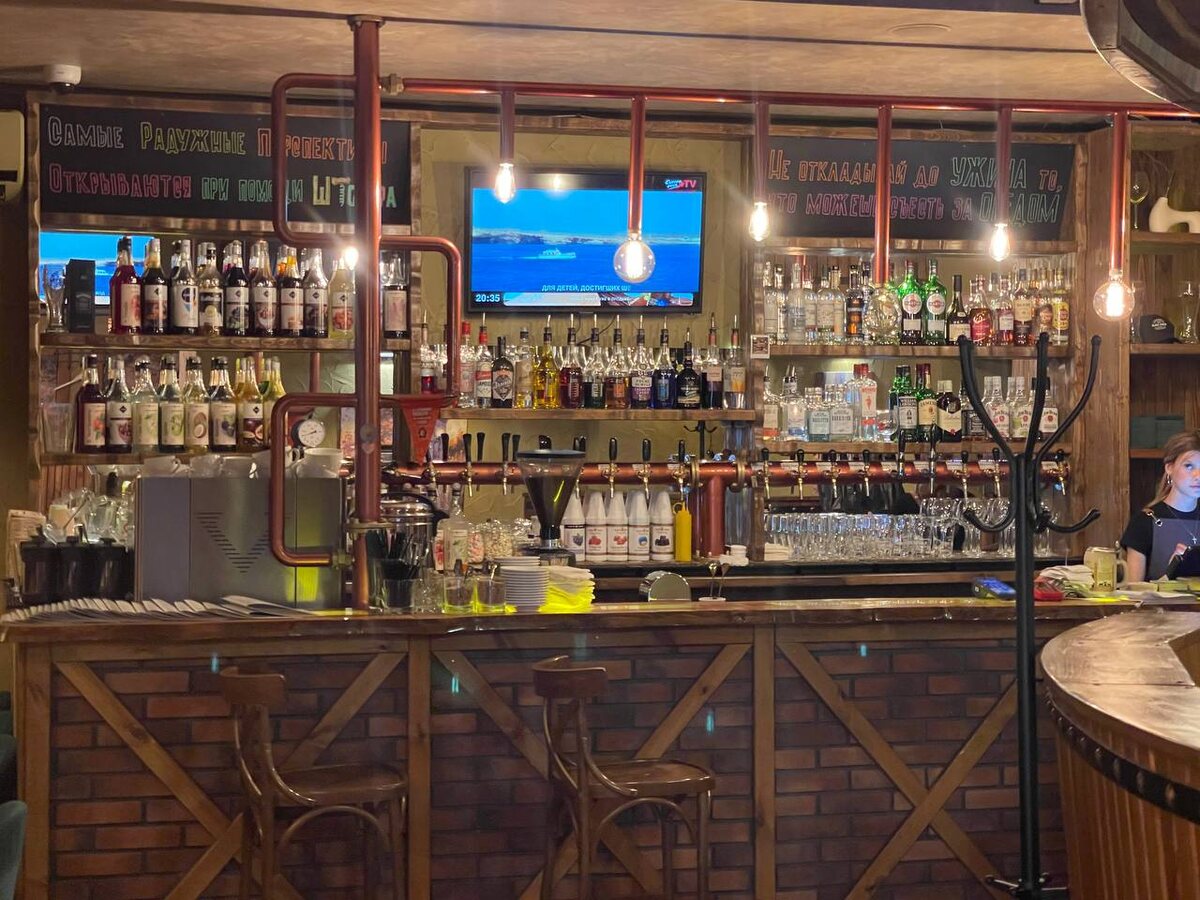 Гастробар оформлен в стиле гранж-лофт, где много древесных элементов и приглушённое освещение, создающее непринужденную атмосферу. На первый взгляд, концепция свежа, но недочёты в оформлении общественных зон могут насторожить критичного клиента.