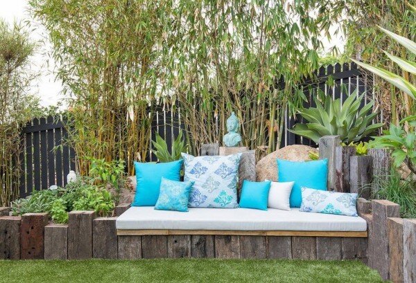 - Диван-скамейка в цветнике. Это стильное решение идеально впишется в ваш сад. Используйте деревянные брусья как поддержку для лавочки, а мягкие подушки придадут комфорта.
