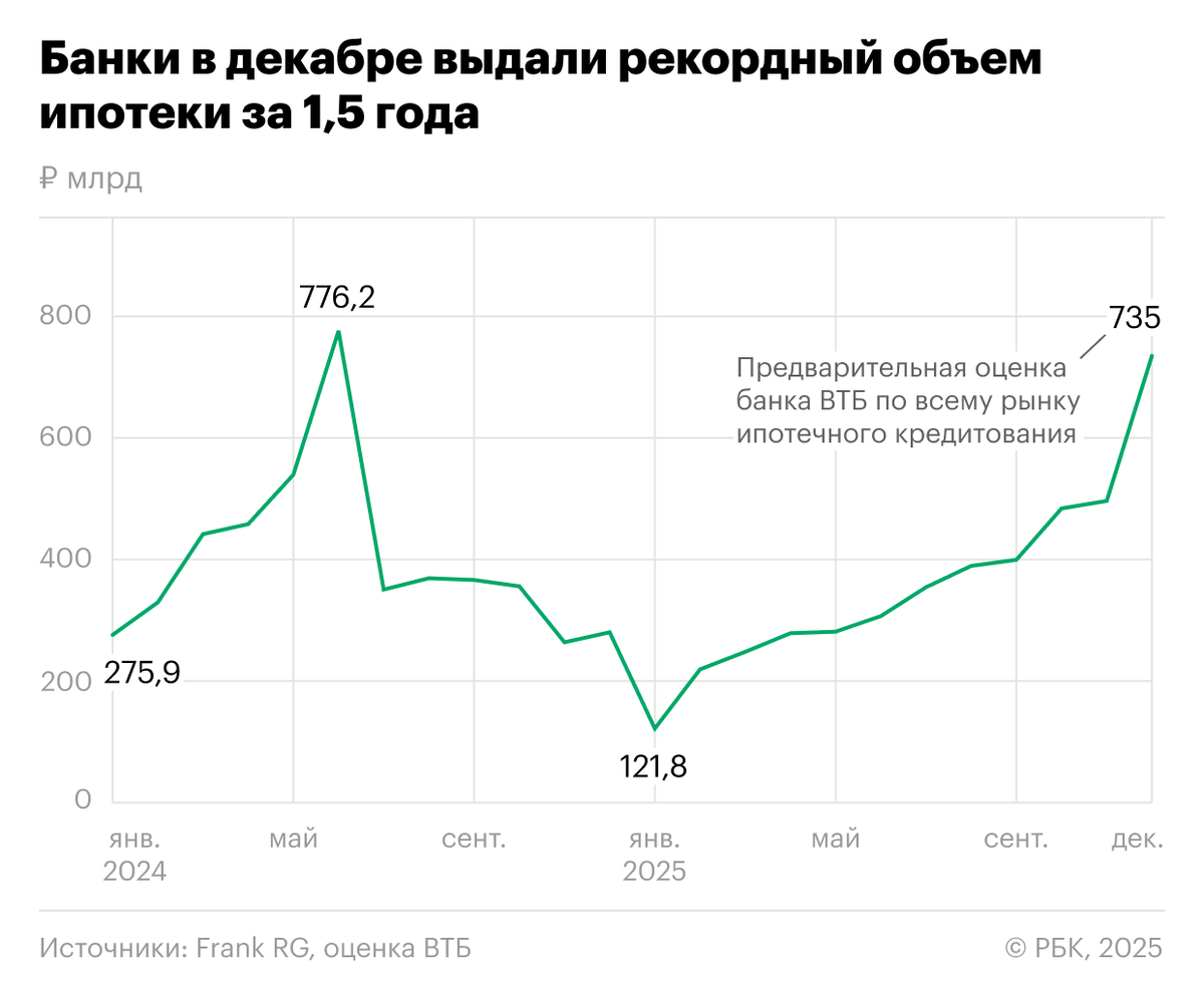 По данным экспертов ВТБ, в декабре выдано кредитов на жилье на сумму 735 миллиардов рублей — это на 48% больше, чем в ноябре, и в 2,6 раза выше, чем год назад. По состоянию на конец месяца, ипотеки с государственной поддержкой составили 88% от общего числа выданных кредитов, что на 0,5% выше рекорда июня 2024 года.