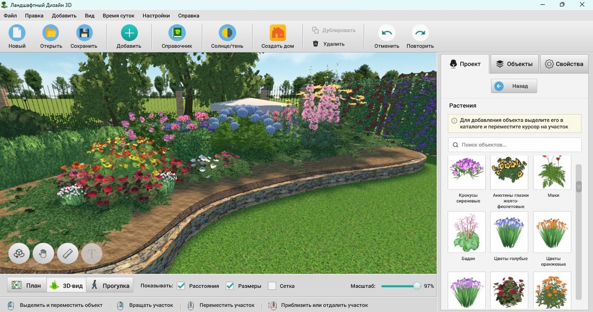 Эта онлайн и десктоп-программа с акцентом на визуализацию позволяет загружать фотографии своего участка и добавлять объекты из обширной библиотеки. В состав входят не только цветы и кустарники, но и элементы для обустройства. Ее преимущества: