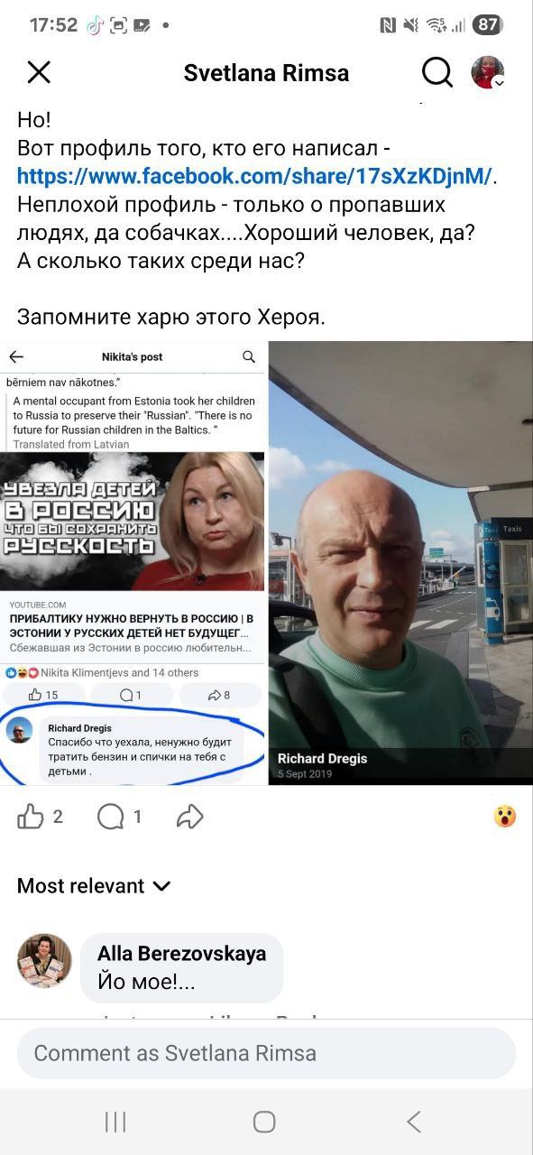 Этот латышский нацист Ричард Дрегис открытым текстом пишет, что если бы Оксана Пост с детьми не уехала из Эстонии (материал про неё), то с удовольствием сжёг бы всю её семью.