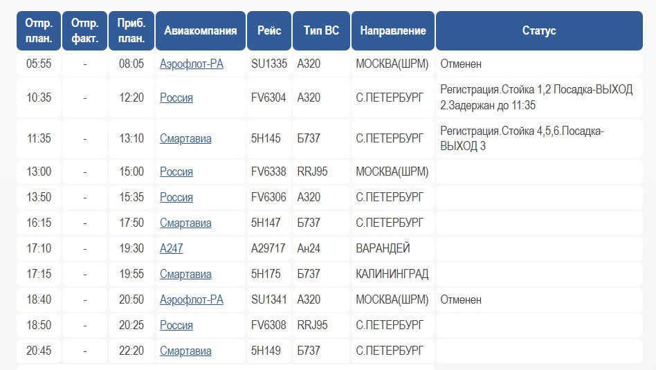 Вылет: 4 рейса в Питер и 1 в Нарьян-Мар.