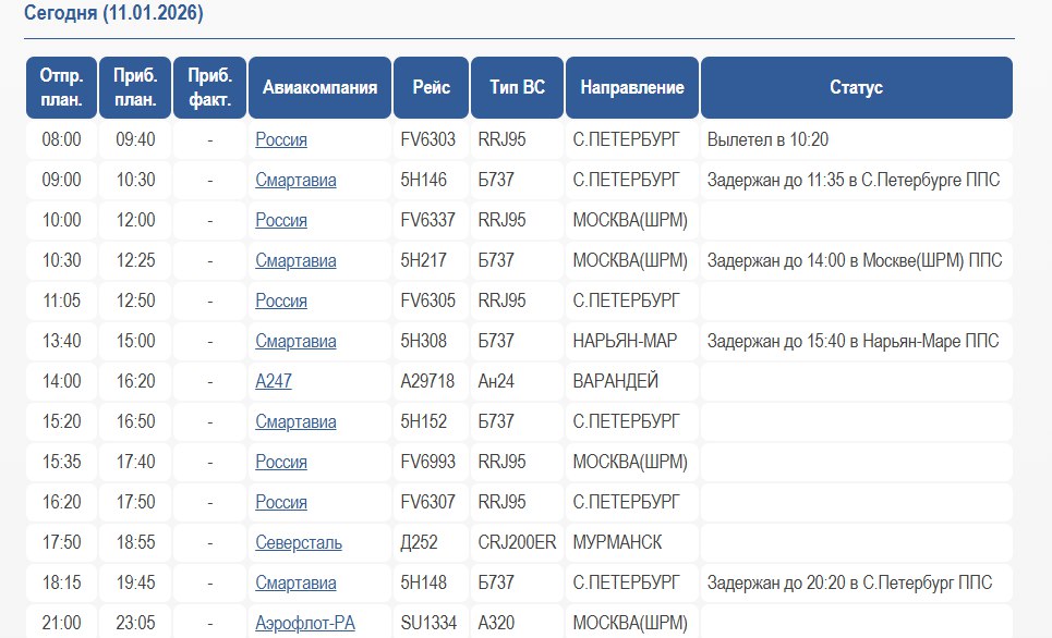 Прилет: 3 рейса из Питера, 1 из Москвы и 1 из Нарьян-Мара.