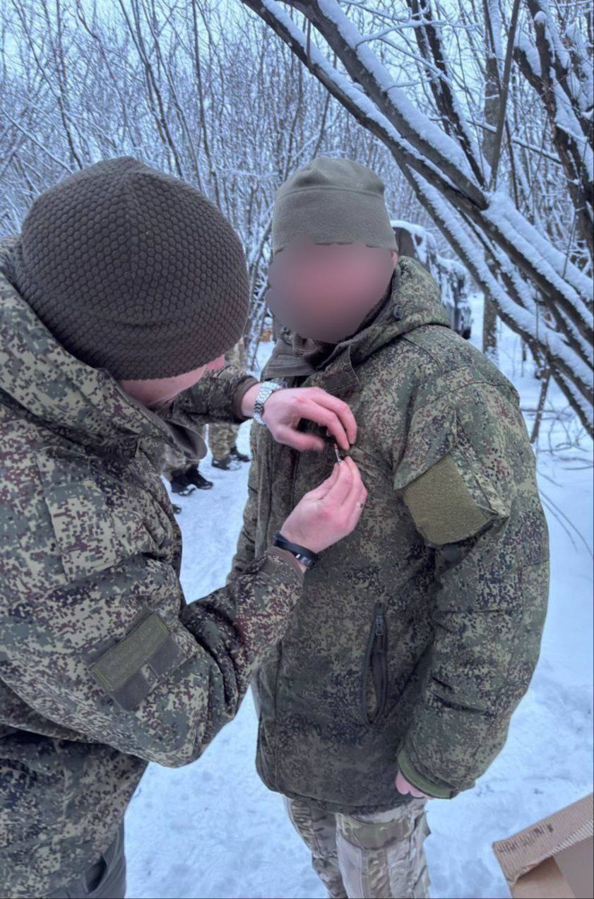 На этих кадрах — момент награждения. Все происходит там, на передовой, в кругу боевых товарищей, которые как никто другой знают истинную цену этой заслуги.