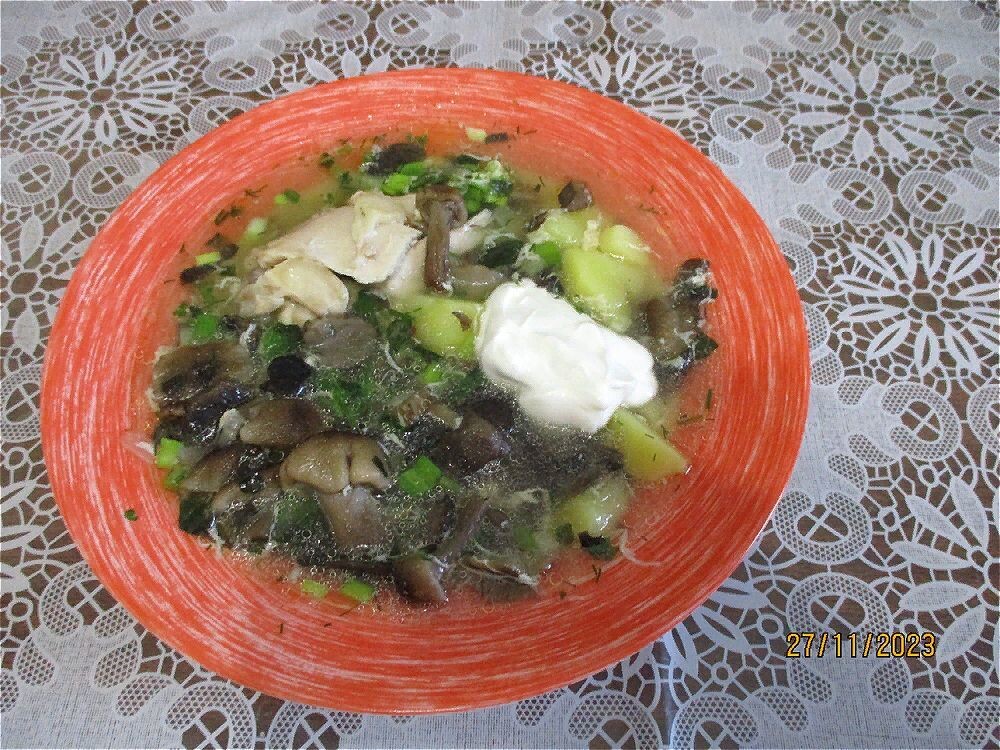 Спустя 30 минут с момента закладки курицы в бульон, необходимо снятие пены, после чего в кастрюлю закладывается нарезанный картофель. Его стоит варить до полной готовности, после чего мясо вынимается. Готовые грибы добавляются в суп, и оставляем его покипеть на медленном огне еще 5–7 минут.
