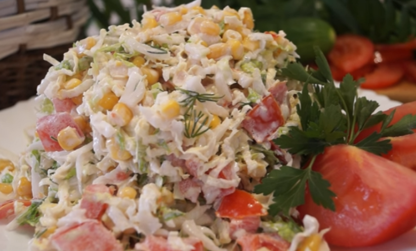 - Вкус: гармония сочной капусты, кисловатых помидоров и сладкой кукурузы создает идеальный ансамбль ароматов и текстур.