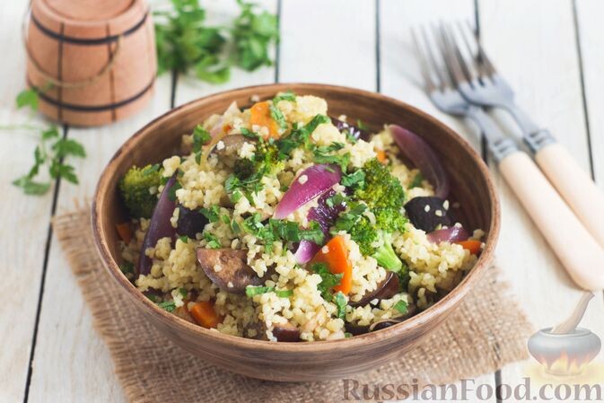 - Булгур с баклажанами, брокколи и грибами: Этот питательный гарнир сочетает пшеничную крупу с ароматными овощами, такими как морковь и красный лук. Каждый ингредиент добавляет свою ноту: баклажан придает нежность, а обжаренные грибы — насыщенный аромат.