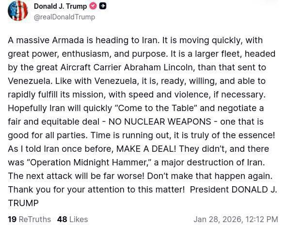 Президент США опубликовал очередной экспрессивный пост с восклицаниями и капслоком, в котором заявил, что к берегам Ирана движется огромная армада – еще мощнее той, что была отправлена к Венесуэле.