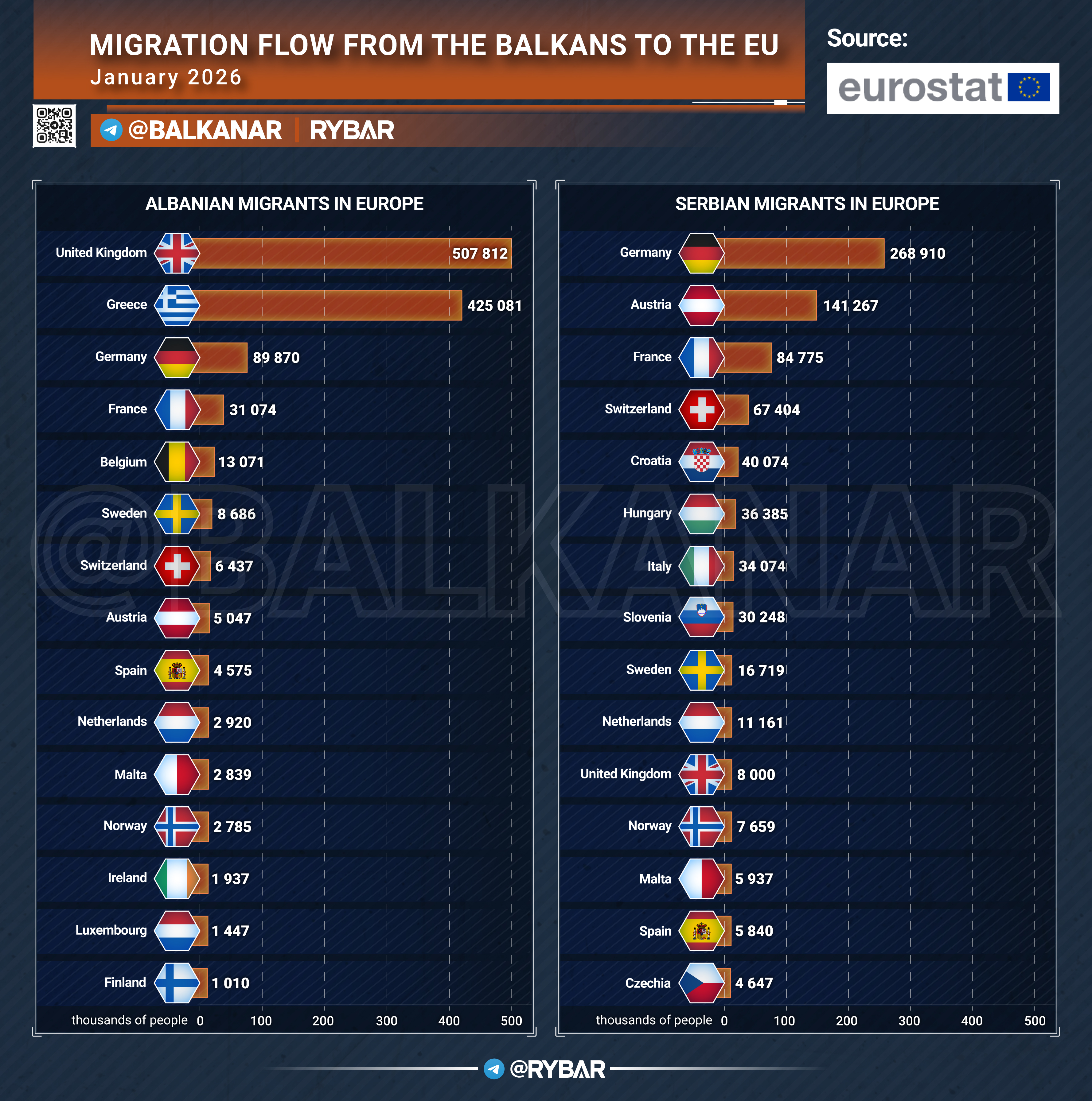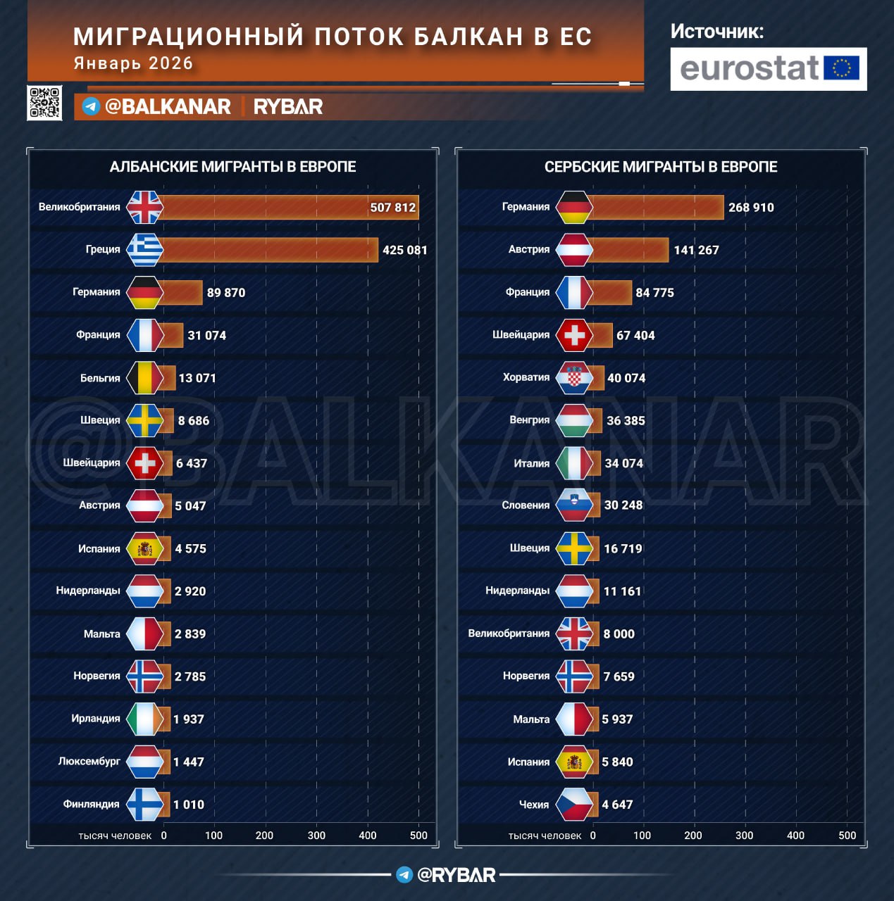 Почему албанцев в Италии и Греции в разы больше, чем в Германии, а сербская диаспора, наоборот, десятилетиями концентрируется в центре Европы? Ответ кроется в траекториях миграции, которые зафиксированы в сухих цифрах Eurostat.