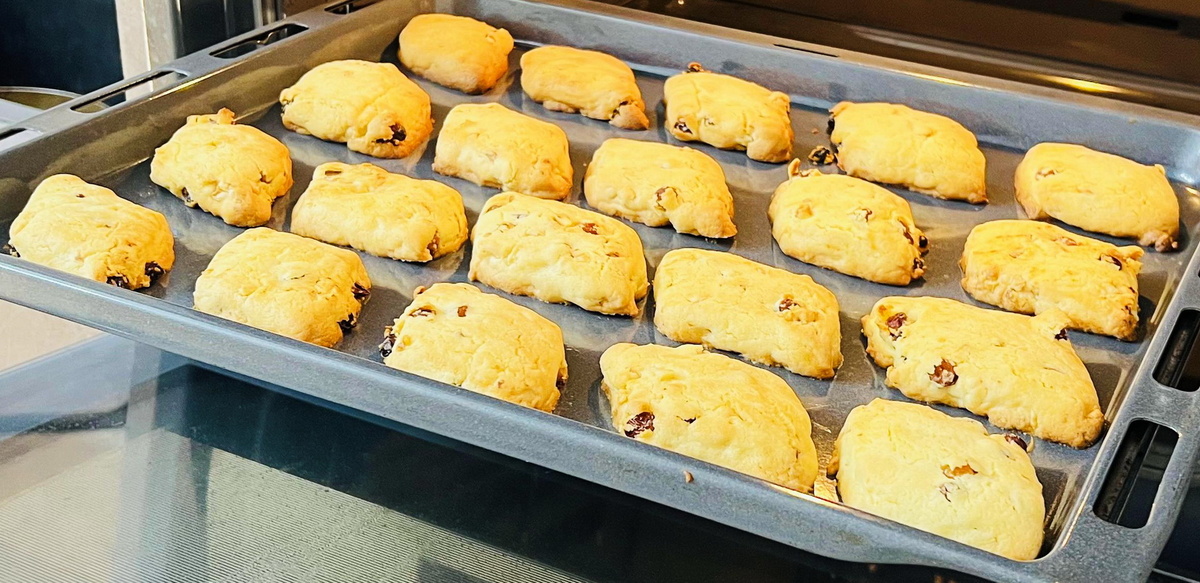 Сформируйте из теста две колбаски, нарежьте их на порции произвольной формы и разместите на противне. Выпекайте при температуре 180 градусов в течение 15-20 минут. Идеально подходит для сладкого чаепития или угощения на праздничном столе!