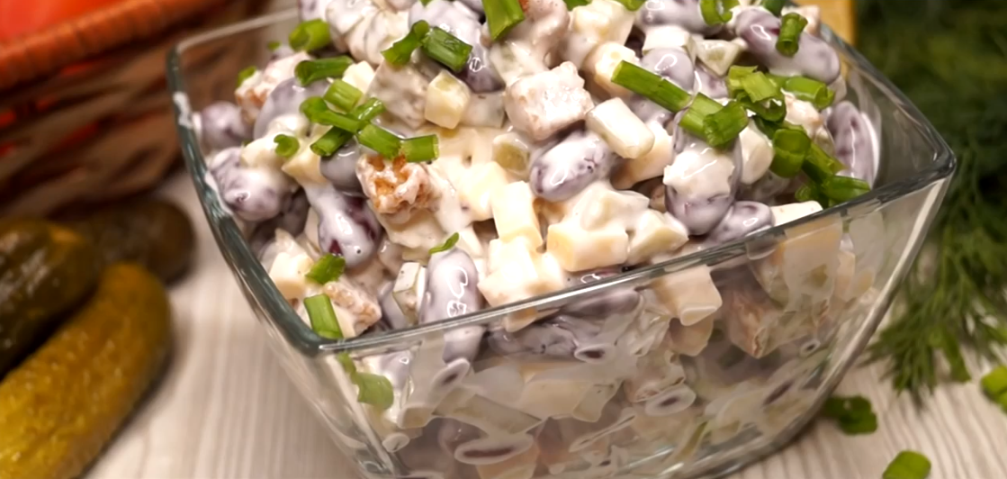 Салат с фасолью и хрустящими сухариками это идеальное блюдо для обеда или ужина, которое не надоедает. Его приготовление займёт всего несколько минут, а результат приятно удивит вкусом и питательностью.