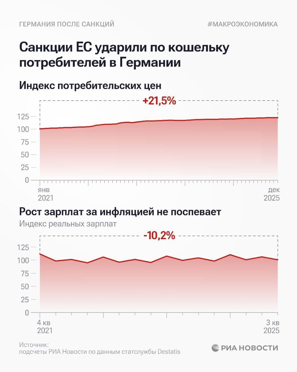 –10,2% — снижение реальных зарплат в Германии с начала Специальной военной операции. Доходы немецких семей не успевают за инфляцией и, наоборот, продолжают снижаться.