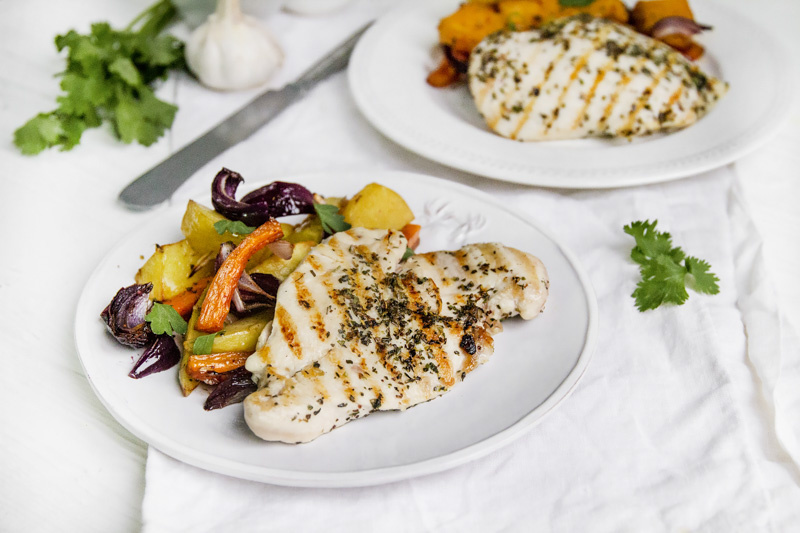 Пока овощи в духовке, подготовить куриное филе: промыть, обсушить, разрезать вдоль на две части — получатся два стейка. Посолить, поперчить и натереть оставшимися прованскими травами.