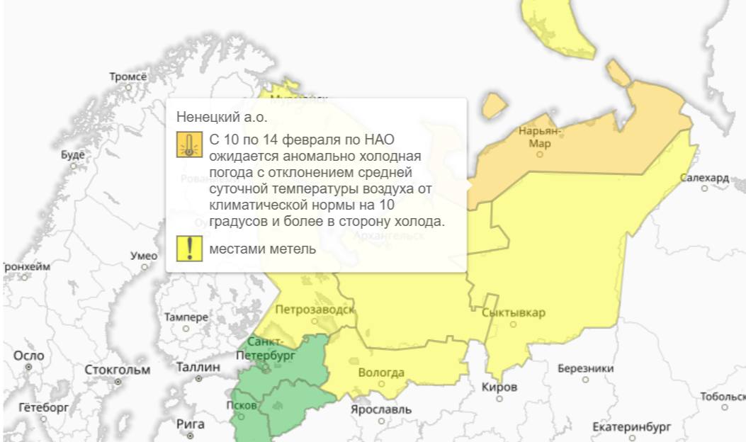 Аномальные холода установились в НАО с 10 по 14 февраля.