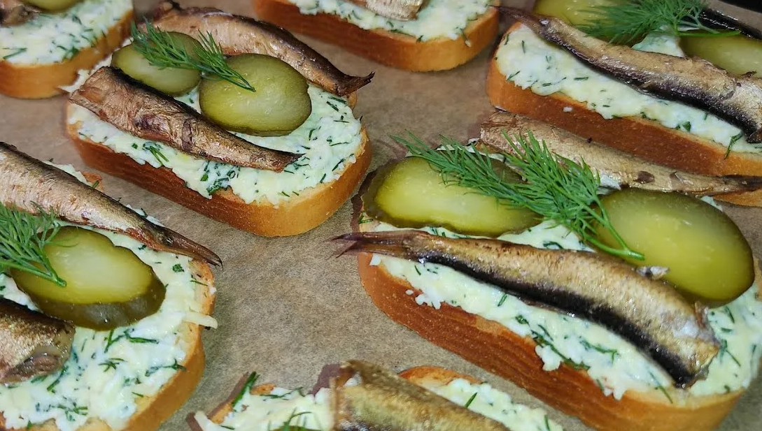 - Классический тост: Смешайте сливочный сыр с солеными огурцами и шпротами, украсив свежим укропом.