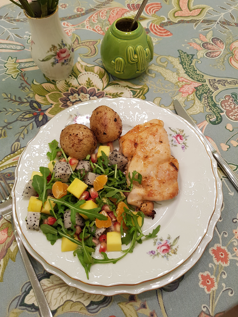 Соберите на тарелках курицу, картофель и свежую рукколу, дополните нарезанными фруктами и зернами граната. И не забудьте про традиционный аргентинский напиток мате, который завершит этот вечер!