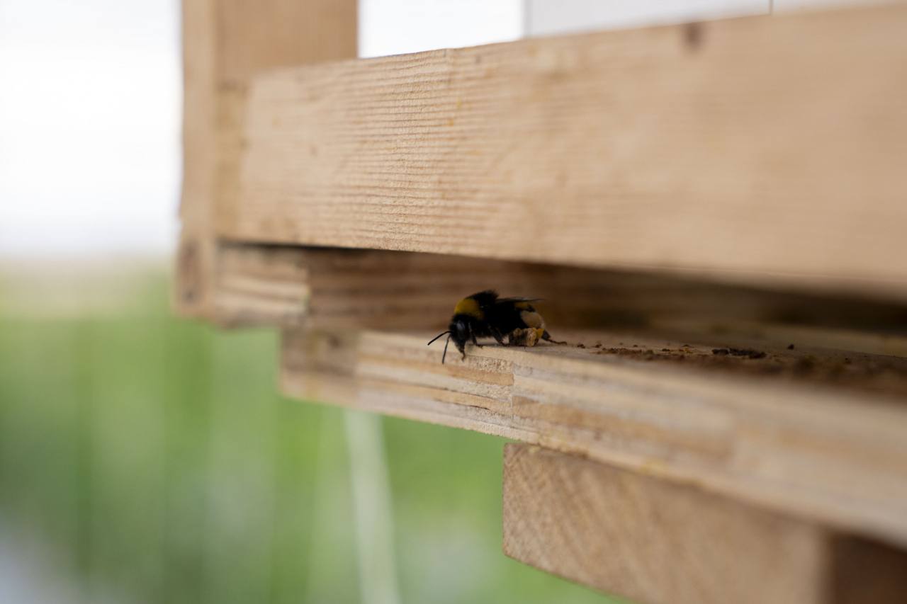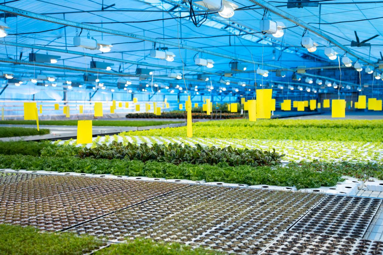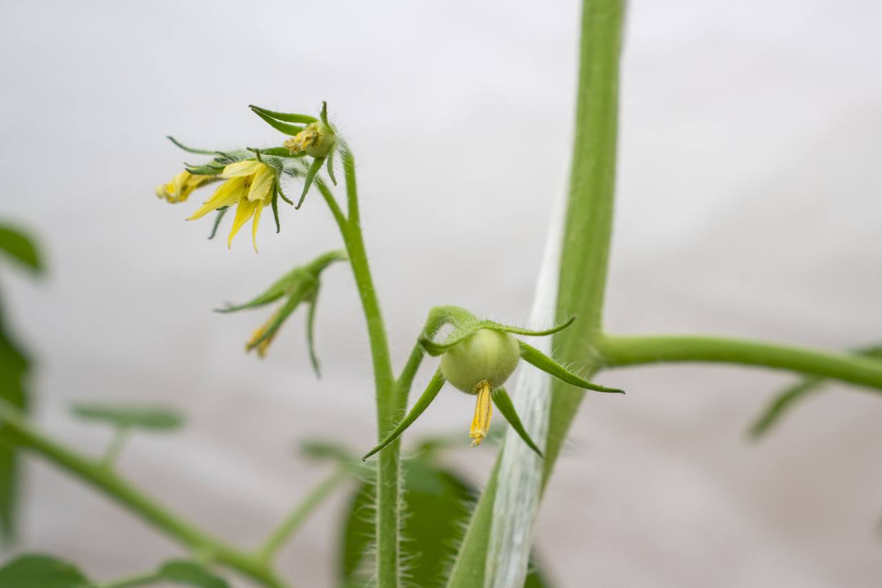В теплице площадью 828 квадратных метров соседствуют зелень, редис, огурцы и томаты. Последние как раз начали своё цветение.