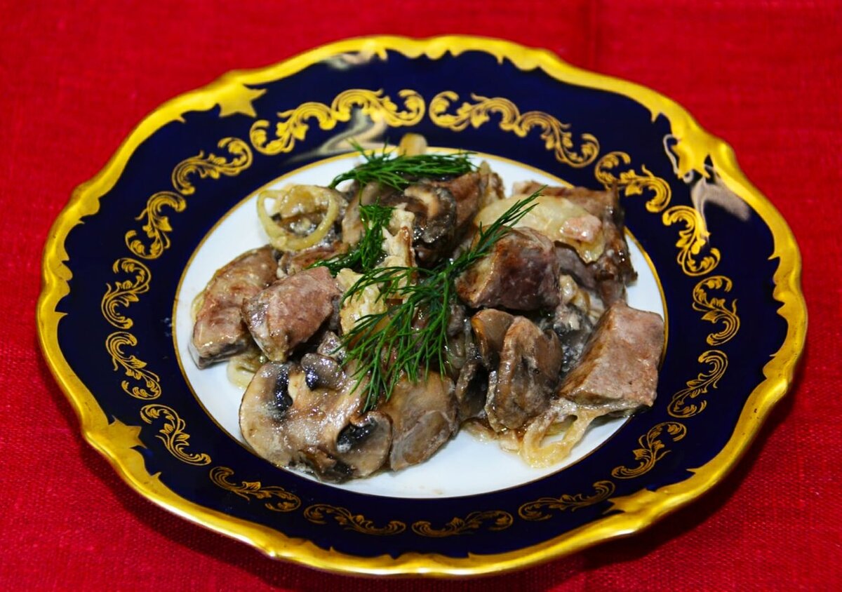 Куриная печень с грибами в сливочном соусе