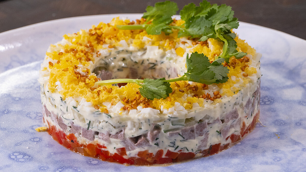 Вареное яйцо разделяется на желток и белок: белок мелко нарезается и выкладывается в салат, а желток натирается на терке и добавляется в финале. Завершает творение жареный кунжут. Дайте салату немного постоять, чтобы все слои пропитались ароматы друг друга. Перед подачей аккуратно удалите кольцо и украсьте зеленью для завершения этой кулинарной картины.