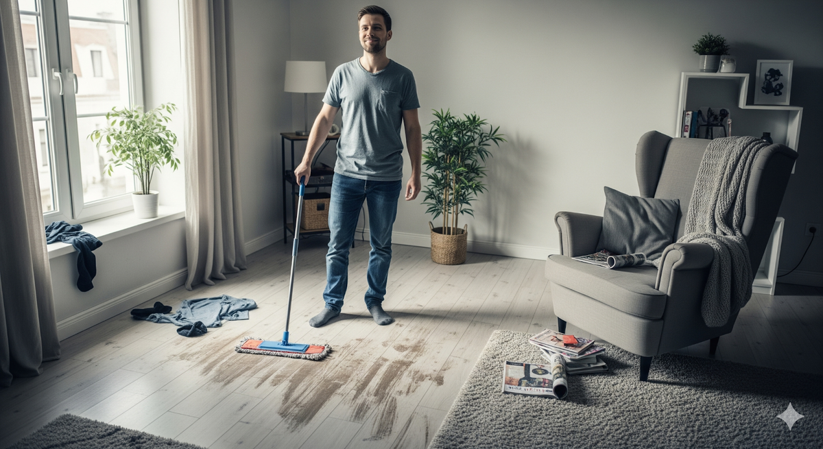 Как правило, такая уборка кажется успешной, пока не заглянешь в угол комнаты — и тут становится ясно, что общий вид далёк от идеала. Многие мужчины искренне верят, что сделали все необходимое, даже если в комнате остались заметные следы от тапок или забытые вещи.