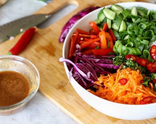 Яркий овощной салат с кунжутом станет настоящим украшением любого стола благодаря своей насыщенной палитре вкусов и текстур. Он не только радует глаз, но и взбадривает благодаря своей пикантной ноте.