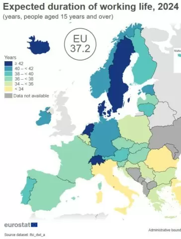 Средний показатель по странам Европейского Союза составляет около 37 лет. В России, по информации выборочных обследований Росстата, мужчины работают примерно 34-36 лет, а женщины — 32-34 года, что ставит страну на уровень Южной Европы.
