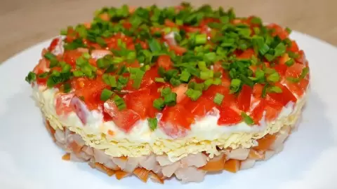 Салат выстраивается в стильной многослойной композиции, что делает его не только вкусным, но и очень привлекательным на вид. Каждый слой можно заправить майонезом — как на всю порцию, так и на отдельные слои. Это позволит добиться нужной степени насыщенности и вкусового разнообразия.