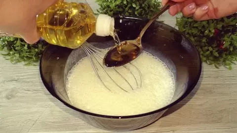 Начать стоит с теплого кефира, который нужно вылить в широкий сосуд. Добавить к нему сахар, соль и соду, тщательно перемешать. Количество соли можно варьировать в зависимости от солёности сыра и колбасы. Затем влить растительное масло.