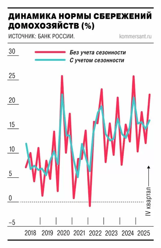 Мониторинг экономики домохозяйств: Банк России впервые обнародовал квартальную оценку нормы сбережений, отражающую долю доходов, не направляемую на текущее потребление. Этот показатель помогает аналитикам оценить не только текущий спрос, но и его потенциальную динамику. По последним данным регулятора, в четвертом квартале 2025 года норма сбережений составила 16% с учетом сезонных колебаний, в то время как без учета этих факторов показатель достиг 22,9%.