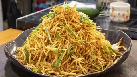 1. Для начала картофель натереть на терке для корейской моркови. Затем промыть его в воде и выложить на салфетку, чтобы убрать излишнюю влагу. Обжарьте картофель до золотистой корочки в большом количестве растительного масла.