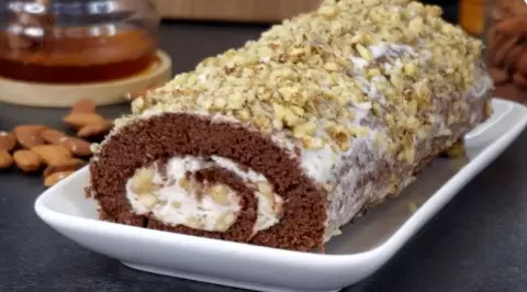 6. Бисквит разворачивается, намазывается кремом, сворачивается в рулет и покрывается оставшимся кремом. Украсить десерт можно орехами. Оставить рулет в холодильнике на 4 часа.