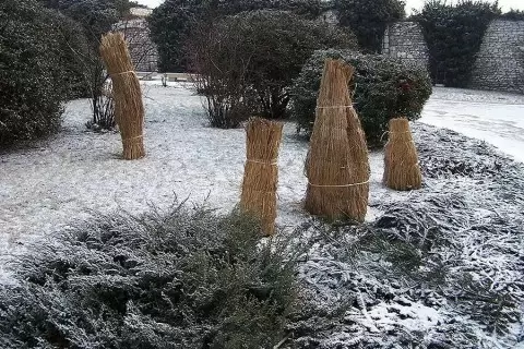 - 2. Искусственное укрытие. Если нет агроволокна, можно использовать подручные средства: накрыть низкие растения деревянными ящиками или большими ведрами. Также рекомендуется обернуть стволы молодых деревьев старым одеялом или мешковиной, чтобы защитить их от холодного ветра.