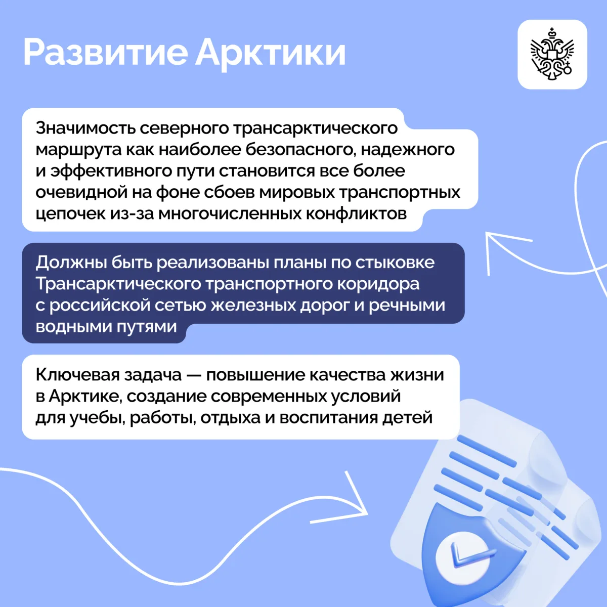 Основной темой обсуждения стало развитие Арктической зоны России и Трансарктического транспортного коридора. Участники также рассмотрели вопросы оказания бесплатной юридической помощи гражданам, обеспечения интернетом малых населенных пунктов от 100 до 1 000 жителей и ограничения работы мобильного интернета в связи с угрозой атак БПЛА в крупных городах страны.